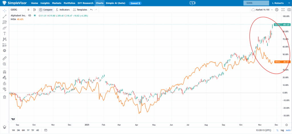 The graph below shows that the market is paying attention to the rise of TPUs and Nvidia’s eroding market share. Bear in mind that Nvidia has proven to be incredibly innovative and cutting-edge, so expect it to offer competing TPU products while maintaining a near-monopoly on its AI GPUs.